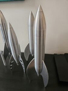 I have been fixated with rockets since I was just a kid. I built model rockets and launched them in my front yard growing up in Alaska. Once I learned how to make them using a CNC machine, I was completely focused on designing and making the most quintessential rocket design. A design that epitomizes space exploration from the early 50’s and 60’s. Modern rockets are interesting, and a few modern designs pique my interest, but for now I am focusing on making a more vintage design.
